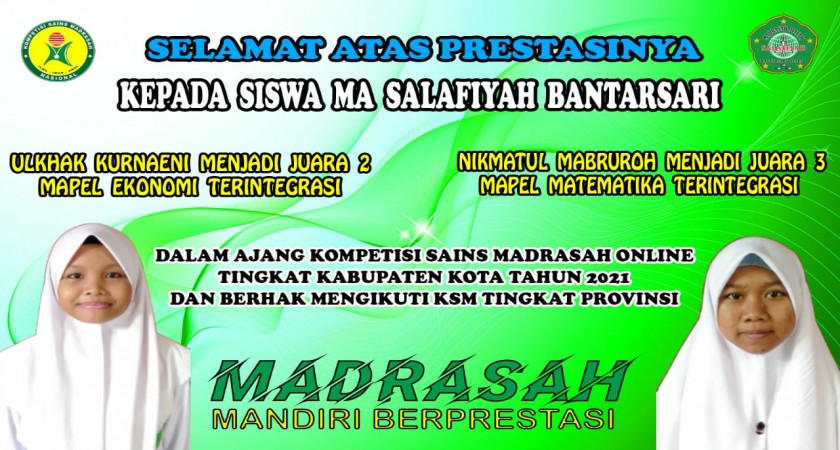 "Kami Sampaikan terima kasih kepada Kesiswaan selaku panitia dan Guru Pembimbing mapel KSM, serta khususnya kepada siswa yang telah membawa nama baik MA Salafiyah Bantarsari dalam Ajang Kopetisi Sains Madrasah (KSM) Tahun 2021.